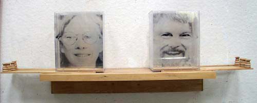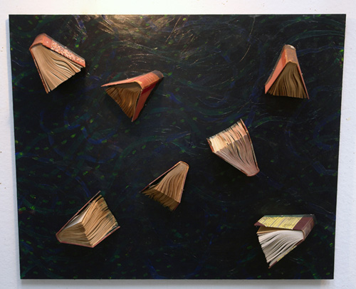 The mixed- media works employ everyday objects as the physical media, subject, and as metaphor, to explore both